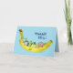 Wirst du Bananen mit Dank zum Ausdruck? Nichts sagt es wie Affen. Hier sind 4 niedliche Cartoon Affen in einer Banane getan in Cartoon Aquarellbild, Sprichwort Vielen Dank auf der Vorderseite. In einem skurrilen Text steht: "Mit Begeisterung!!" In Gelbtönen mit hellblauem Hintergrund und blauem Text, mit grünen Affen. Eine ist rosa braun, und seine Zunge hängt in aufgeregtem düsterem Dank. Bearbeiten Sie den Text, um eine eigene personalisierte Nachricht zu erstellen.