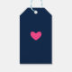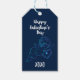 Ein Geschenkschild mit einem süßen Babycherub, der ein Spitzen-Herz trägt. Gezeichnet in leuchtend neonblau und lila Farben Set auf einem blauen Hintergrund. Text sagt Happy Valentine's Day xoxo.