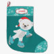 Ein bezaubernder kleiner Eisbär hat auf diesem niedlichen WeihnachtsStrumpf eine lustige Skaten. Er trägt eine rote Strumpf-Kappe und einen blauen Schal. Das Bild wird auf einem aquamarinen Hintergrund platziert, und ein aquamariner und weißer Schneeflockenmusterrahmen befindet sich oben und an den Zehen. Der Name Ihres Kindes ist auf einem rot gesäumten weißen Banner am oberen Rand des Musters der Schneeflocke. Die Rückseite des Strumpfs ist das gleiche aquamarin-weiße Schneeflockenmuster.