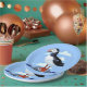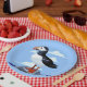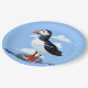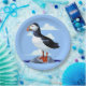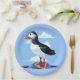 Niedlicher Puffsänger mit seinem typisch schwarz-weißen Gefieder und seinem bunten Schnabel, stehend auf einem Felsen, im Ozean. Original Vector Illustration Copyright BluedarkArt The ChameleonArt.