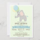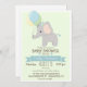 Niedlicher Babyelefant mit pastellblauen, grünen und gelben Ballons; Baby Dusche Einladung. Dieses niedliche Retro-Ambiente lädt zum Wohlfühlen ein, zum Babyduschen oder zum Sprinkle wechseln. Niedliches, einfaches, schlichtes Design. Elefanten, Rotkehlchen, eisblaues Band und Herz, brauner Schriftart und weißer Hintergrund. Ideal für Dschungeltiere, Zootiere oder Safari-Thema Babydusche oder Sprinkle!