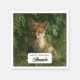 Papierservietten mit einem Foto mit einem niedlichen kleinen Babyfuchs mit rot-weißem Fell. Umgeben von üppig grünen Blätter und Gräsern.