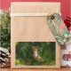 Sticker mit einem Foto mit einem niedlichen kleinen Babyfox mit rot-weißem Fell. Umgeben von üppig grünen Blätter und Gräsern.