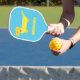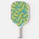 Dieses personalisierte Pickleball-Paddel (sagen Sie, dass dreimal schnell!) ist Bananen. Auf der Vorderseite ist eine Abbildung eines niedlichen Hundes im Stil der Dackel aus gelben Bananen. Es gibt einen Platz, um einen Namen unter der Grafik hinzuzufügen. Auf der Rückseite ist ein koordinierendes Muster von Bananenhunden, zusammen mit einigen grünen tropischen Palmen Blätter vor einem hellblauen Hintergrund.