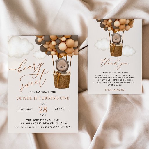 Fügen Sie Ihrer Geburtstagsfeier eine persönliche Touch mit diesen stilvollen und unvergesslichen Party hinzu! Das Design ist mit einem Bären mit braunen Ballons auf beigem Hintergrund gestaltet.