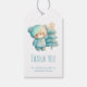 Geschenke Tags mit einer schönen Abbildung. Ein gemütlicher Bär mit Sternen und Glitzern in seinem Fell. Stehend neben einem Weihnachtsbaum. Pastellblau-grün. Whimsical und niedlich.