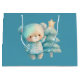 Geschenktasche mit einer ansprechenden Abbildung. Ein gemütlicher Bär mit Sternen und Glitzern in seinem Fell. Stehend neben einem Weihnachtsbaum. Pastellblau-grün. Whimsical und niedlich.