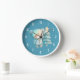 Eine Uhr mit einer hübschen Abbildung. Ein gemütlicher Bär mit Sternen und Glitzern in seinem Fell. Stehend neben einem Weihnachtsbaum. Pastellblau-grün. Whimsical und niedlich.