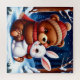 Illustration eines fröhlichen Teddybären, der während einer schneebedeckten Winternacht ein sonniges Wetter knuddelt, umgeben von festlichen Feriendekorationen und einem bunten Spielzeugzug.