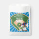 Dieses niedliche First Birthday Gefallen-Taschendesign mit einem bezaubernden Welpenhund, der einen Baseballhut trägt und zum Ball bereit ist. Der Hintergrund ist ein Baseballfeld mit blauer Sternexplosion.