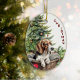 An der Vorderseite dieses Holiday-Ornaments befindet sich das Bild eines hübschen kleinen Beagle-Hundes, der in seinem Korbbett aus Korbweide vor einem verzierten Weihnachtsbaum liegt. Kurzer roter Text an der Seite sagt "CHRISTMAS". Auf der Rückseite steht rot und grün "MERRY CHRISTMAS", und es gibt zusätzliche Textfelder, die Sie nach Ihren Wünschen anpassen können.