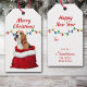 An der Vorderseite dieses Holiday Geschenketiketts steht ein Bild eines bezaubernden Beagle-Hundes in einer rot-weißen Weihnachtsgeschenktasche. Hinter dem Hund befindet sich eine Reihe farbenfroher Urlaubslichter. Im Text oben steht "Frohe Weihnachten". Die Rückseite des Tags wiederholt das Bild der Holiday-Lichter, mit Textfeldern in rot, die Sie anpassen können.