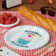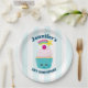 Teller aus Party mit hellblau-weiß gestreiftem Hintergrund. Obergeschichtet ist ein niedlicher, blauer Kuchen mit rosa Zuckerguss und einem kawaii lächelnden Gesicht. Eine Kirsche oben hat auch ein niedliches Gesicht. Ein Sternschuss fliegt in der Luft. Personalisieren Sie Ihren Aufenthalt mit einem Namen und Veranstaltungstitel wie Geburtstag oder Babydusche.