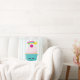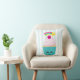 Ein Kissen mit hellblau-weiß gestreiftem Hintergrund. Obergeschichtet ist ein niedlicher, blauer Kuchen mit rosa Zuckerguss und einem kawaii lächelnden Gesicht. Eine Kirsche oben hat auch ein niedliches Gesicht. Ein Sternschuss fliegt in der Luft.