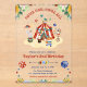 Niedliches Watercolor Niedlich Circus Design mit Zirkuszelt, Fuchs, Elefanten, Kaninchen und Affen und prächtigen gelben, blauen und roten Blume