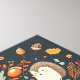 Dieses Design zeichnet sich durch einen bezaubernden, skurrilen Igel aus, der Geweihe aus Herbstblättern und Blume trägt. Der Igel liegt mitten im Zentrum und ist von herbstbezogenen Elementen wie Akornen, Kieferntönen, bunten Blätter, Äpfeln und Beeren umgeben. Es erscheint auch ein niedlicher Vogel, der die gemütliche Waldatmosphäre noch verstärkt. Die Illustration hat eine weiche, abgedämpfte Farbpalette aus Orangen, Braun, Rot und Blues, die das warme, rustikale Gefühl des Herbstes weckt. Das Wort "Herbst" wird in einem spielerischen Skript am Ende geschrieben, das das Design vervollständigt.