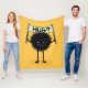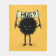 Umarmte Decke mit einem niedlichen bösen Monster - grinsender haariger Charakter aus der Familie des Bösen Blume Bug. Es enthält ein Schild mit der handgeschriebenen Welt "Umarmen?". Dieses freundliche, komische Geschöpf hat hübsche, kleine, totfreie Socken, nur um sich in dieser unfreundlichen Welt die Füße warm behalten.