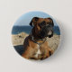 Boxer-Hündchen, das auf einem Strand für Boxerhundeliebhaber stillsteht.