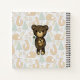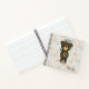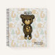 Ein personalisiertes Spiralheft mit einer einfachen Abbildung eines braunen Bären aus Cartoon mit einer gelben Färbung. Hallo geschrieben über seinem Kopf. Der Hintergrund hat ein verblasstes, sich wiederholendes Muster, bestehend aus Füchsen, Bäumen und Vögeln.