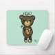 A personalized mousepad with hat eine einfache Illustration von a cartoon brown bear holding a yellow daisy. Hello written above his head.