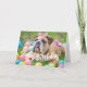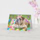 Grumpiger niedlicher Bulldog mit rosa Band, umgeben von bunten Kugeln mit "Happy Birthday!" Text.