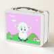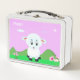 Niedlicher Cartoon, Blume & Stern auf violettem Hintergrund Lunch Box. Glücklicher Text kann personalisiert sein.