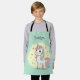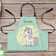 Diese zauberhafte, personalisierte Schürze von Mädchen besticht durch ein niedliches Einhorn mit pastellfarbener Regenbogenmane und Schwanz, glitzerndes goldenes Horn und Akzenten des süßen Herzens, Set vor einem zarten gelben und aquamarinen Hintergrund mit verstreuten Herzen und Sternen.