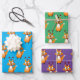 Niedliches, benutzerdefiniertes Packpapier mit Cartoon Fuchsmuster. Version in blau, grün und lila. Geschenkpackidee für Kinder