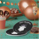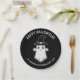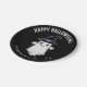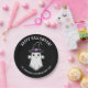 Desteis Cartoon Illustration eines niedlich lächelnden Geistercharakters. Der Geist trägt einen Hexenhut mit lila Details. Die Hintergrundfarbe ist schwarz und es gibt zwei personalisierbare Textbereiche. Eine der Vorlagen lautet: "Happy Halloween!", während auf der anderen zum Beispiel Platz für einen eigenen Familiennamen ist. Dieses personalisierbare Design ist ideal für die unheimliche Jahreszeit.