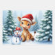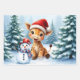 Niedlicher Cartoon Giraffe mit Weihnachtsmannmütze & Snowman in einem festlichen Winterwald. Adorable Weihnachtskunst: Eine lächelnde Cartoon-Giraffe mit einer Weihnachtsmannmütze sitzt neben einem Schneemann in einem schneebedeckten Kiefernwald und verbreitet Feiertagssjubiläum.