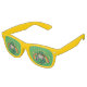Sonnenbrille mit einer Illustration eines niedlichen lächelnden Koboldes mit einem grünen Anzug, einem Hut, während ein Kleeblatt Blatt hält, mit einem bunten Regenbogen im Hintergrund und Sprichwort "Happy St. Patrick's Day" Ein perfektes Design zum Feiern des St. Patrick's Day, gezeichnet von Radka2D