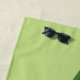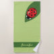 Dieses Badetuch zeigt Desteis Cartoon-Abbildung eines roten Ladybugs mit schwarzen Punkten auf einem großen grünen Blatt. Unten ist ein grüner Streifen mit einem personalisierbaren Textbereich für einen Namen. Die Hintergrundfarbe ist hellgrün.
