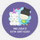 Geburtstagsaufkleber mit einem skurrilen Bild eines Einhorns und Vogels. Dieses Paar lächelt glücklich, während es zusammen herumhängt. Ein kleines Herz schwebt über ihrem Kopf. Unicorn ist weiß mit Engelsflügeln und einem rosa Horn. Der Vogel ist eine grünlich blaue Farbe, die eine schwarze Figur mit einer schwarzen Kätzchen mit Ohren trägt. Eine blaue Wolke stand hinter diesen glücklichen besten Freunden.