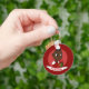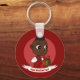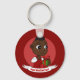 Schlüsselanhänger mit einer Illustration eines niedlich lächelnden, glücklichen Mädchens oder Jungen, trägt das Kind rote und weiße Kleidung und hält ein Geschenk; mit bearbeitbarem Textbogen für Ihren Namen oder Ihre Nachricht, Weihnachtsfeiertagsgestaltung mit rotem Hintergrund
