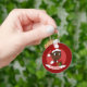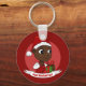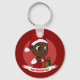 Schlüsselanhänger mit einer Illustration eines niedlich lächelnden, glücklichen, schwarzen Mädchens oder Jungen, trägt das Kind rote und weiße Kleidung und hält ein Geschenk; mit bearbeitbarem Textvorlage für Ihren Namen oder Ihre Nachricht, Weihnachtsfeiertagsgestaltung mit rotem Hintergrund