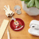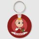Schlüsselanhänger mit einer Illustration eines niedlich lächelnden, glücklichen Mädchens oder Jungen, trägt das Kind rote und weiße Kleidung und hält ein Geschenk; mit bearbeitbarem Textbogen für Ihren Namen oder Ihre Nachricht, Weihnachtsfeiertagsgestaltung mit rotem Hintergrund