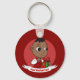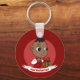 Schlüsselanhänger mit einer Illustration eines niedlich lächelnden, glücklichen Mädchens oder Jungen, trägt das Kind rote und weiße Kleidung und hält ein Geschenk; mit bearbeitbarem Textbogen für Ihren Namen oder Ihre Nachricht, Weihnachtsfeiertagsgestaltung mit rotem Hintergrund