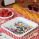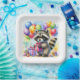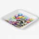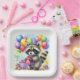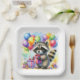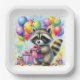 Süße Racon, die ein Geburtstagsgeschenk hält, umgeben von gebürtigen Ballons in Blau, Gelb, Grün, lila und Rosa. Dieser Teller ist niedlich für eine Woodland-Geburtstagsparty oder für alle Kinder, die Raccoons Liebe!