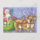 Vintage Abbildung niedlich Frohe Weihnachtsgestaltung mit einem glücklichen, fröhlichen Weihnachtsmann mit einem Sack voller Spielzeuge, der seinen Schlitten fährt und von zwei bezaubernden Rentieren mit Glocken gezogen wird. Ho, ho, ho, die Grüße der Saison!