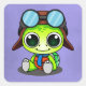 Eine niedliche Chibi Cartoon Abbildung. Eine grüne Babyschildkröte mit einem blauen Schal und einem braunen Aviator mit einer Brille. Große kawaii Augen und ein bezauberndes Lächeln.