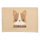 Ein niedliches Design, das Ihren Tag aufhellt. Dieses Design zeichnet sich durch niedlichen kleinen Korgi Hund mit personalisiertem Namen in braunen modernen Sans Serif Schriftart Stil auf hellbraunem Hintergrund aus. Perfekte personalisierte Geschenke für Kinder.