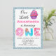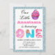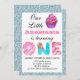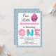 Helle und farbenfrohe hellblaue Glitzer Glitzern zum ersten Geburtstag mit einem süßen und niedlichen Kuchen und Donut und Bonbons. Fügen Sie einfach Ihren vollständigen Namen und Datum, Uhrzeit und Adresse der Geburtstagsparty hinzu. Perfekt für eine süße kleine Prinzessin, die sich um eins dreht!