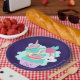 Eine Papiertafel mit einer niedlichen Abbildung mit einem Kuchen und Eis, die vor Freude lächeln. Ein Regenbogen und Herzen umgeben den zeichnend. Eine niedliche, flauschige Wolke lächelt auch vor Glück. Der Kuchen und das Eis haben ein trendiges Einhornhorn. Niedliches und bezauberndes Design voller Freude. Dunkler lila Hintergrund.