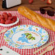 Niedlicher Dinosaurier und Palmenbaum Pappteller