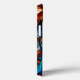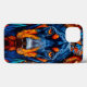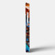 Auffallend und lebhaft bunt abgebildet eines Hundes Gesicht, wahrscheinlich ein Doberman. Das Fell des Hundes wird in tiefer Blues und lebhaften Orangen dargestellt und schafft einen kühnen und künstlerischen Kontrast. Die Augen sind sehr hell, zeichnend auf die Aufmerksamkeit des Betrachters, und die Gesamtkomposition gibt ein Gefühl von Tiefe und Textur. Der Hintergrund ist ein geometrisches Muster, das aus verschiedenen dreieckigen Formen in Blau, Orange und Braun besteht, was den visuellen Einfluss des Hundes verstärkt. Die Facetten und Farben lassen einen abstrakten Kunststil erkennen, der die Eigenschaften des Hundes deutlich hervorhebt.