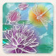 Schöne zeitgenössische violette und lila Wasserlilien, pastellblauer Himmel, orangefarbene Sommersonne und hübsche Libelle.