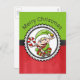 Eine Postkarte mit einem niedlichen grünen Weihnachtself, der auf einem rot-weiß gestreiften Süßigkeitsstock festhält. Frohe Weihnachten geschrieben in einem gekrümmten Text.