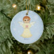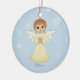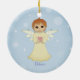Niedlicher kleiner Engel, der ein Herz auf hellblauen Keramik Ornament hält. Text kann personalisiert sein.