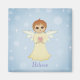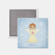 Niedlicher kleiner Engel, der ein Herz hält, und helle Orbs auf hellblauen Magnet. Glaube, Text kann personalisiert sein.