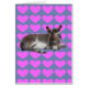 Niedliches, schokoladenfarbenes Baby-Esel-Fohlen, das auf einem blauen Hintergrund mit rosa Herzen schläft. Innerhalb der Karte hat zwei rosa Herzen. Die Karte ist leer für Ihre eigene Nachricht.